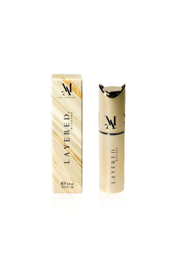 Picture of a woman holding three Mascara's by Mina AlSheikhly A display of all mascara pack shots - the Elevated, Curved, Tailored and Layered Mascaras by Mina Alsheikhly Close up shot of Mina Al Sheikhly face wearing the mascara  Layered Mascara by Mina AlSheikhly Picture of a woman holding Layered Mascara by Mina AlSheikhly