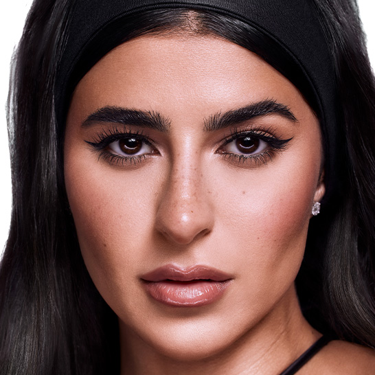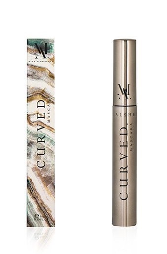 Picture of a woman holding three Mascara's by Mina AlSheikhly A display of all mascara pack shots - the Elevated, Curved, Tailored and Layered Mascaras by Mina Alsheikhly Close up shot of Mina Al Sheikhly face wearing the mascara  Layered Mascara by Mina AlSheikhly Picture of a woman holding Layered Mascara by Mina AlSheikhly